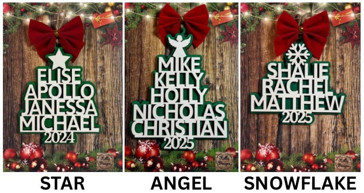 Make your holidays unforgettable with this laser-cut wooden ornament! Celebrate your family with up to 10 custom names, arranged from shortest to longest to naturally create a charming tree silhouette.